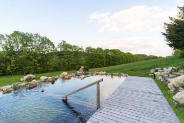 Crystal clear water in the swimming pond, which we keep accessible all year round.